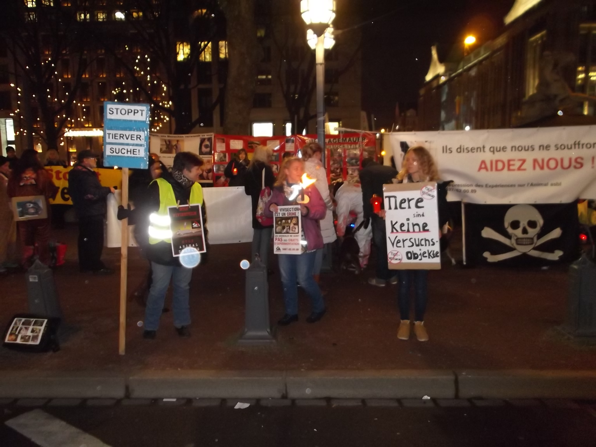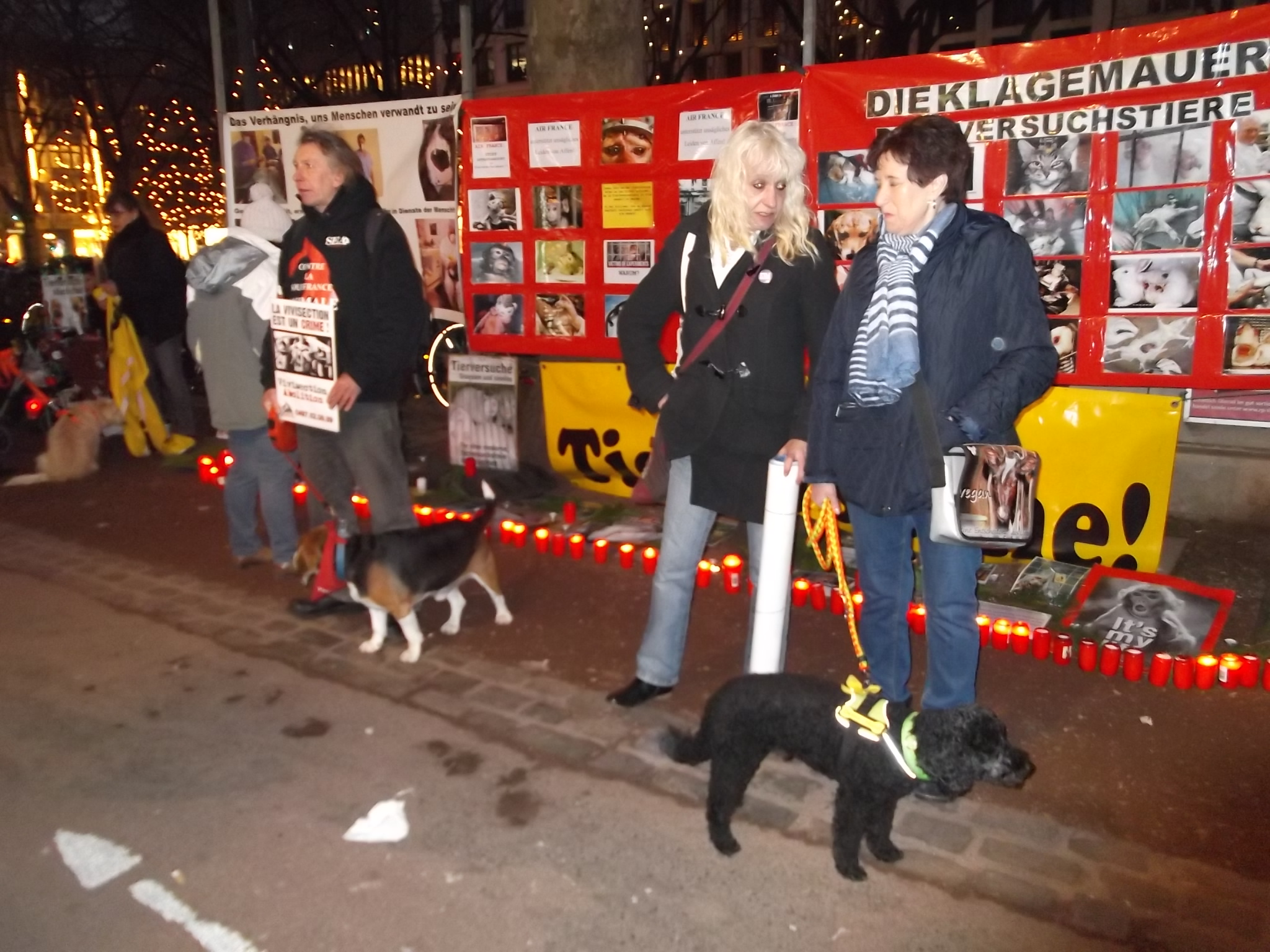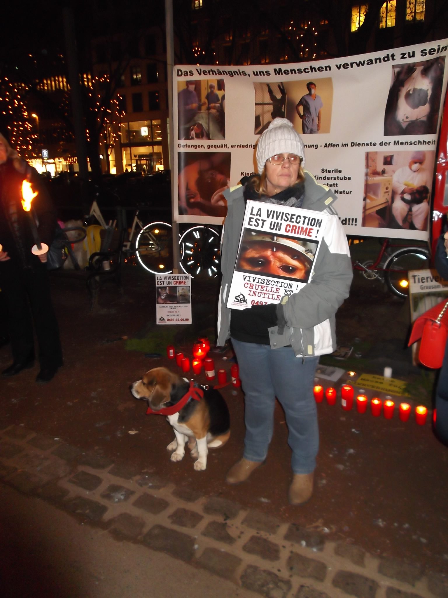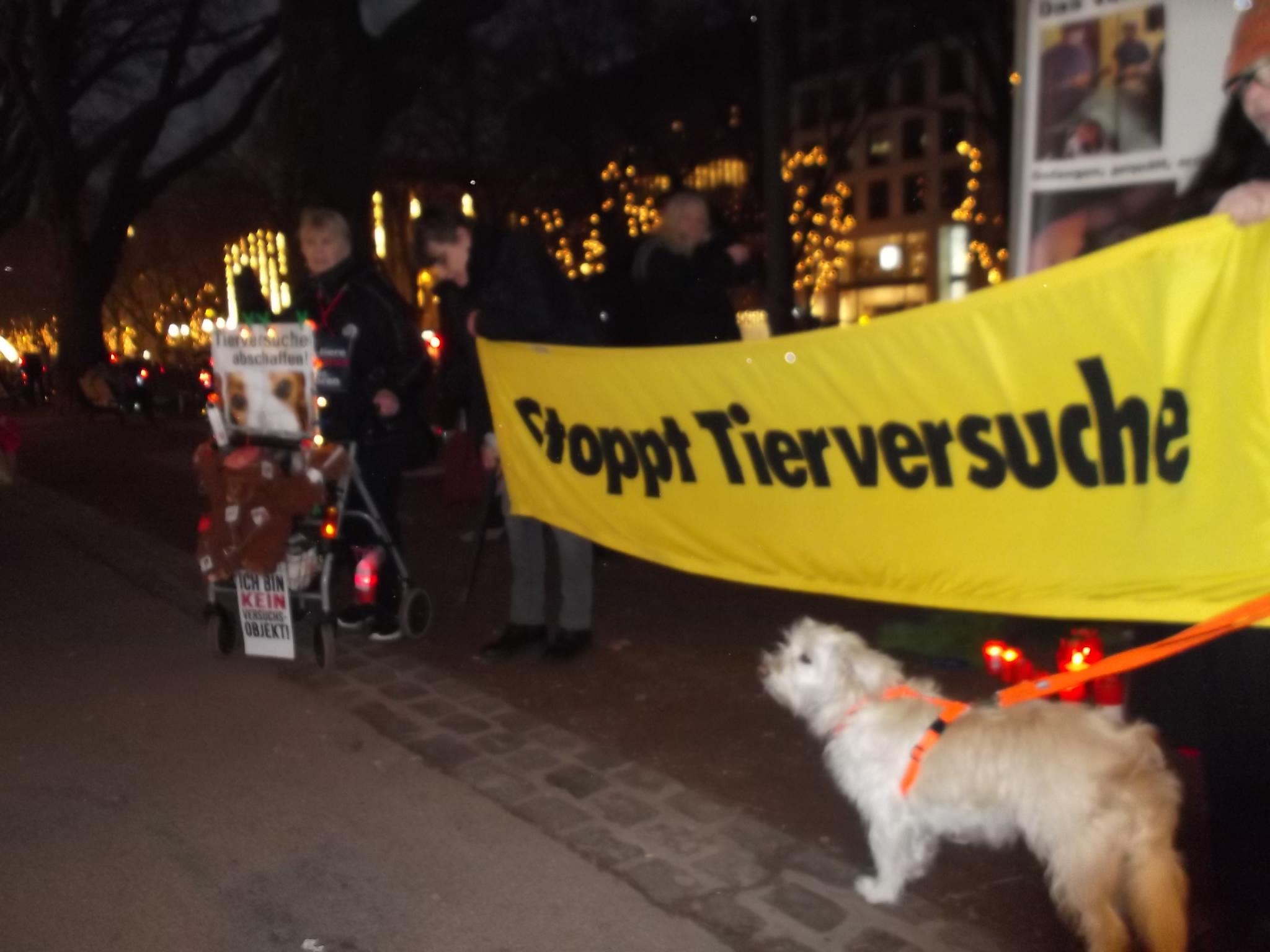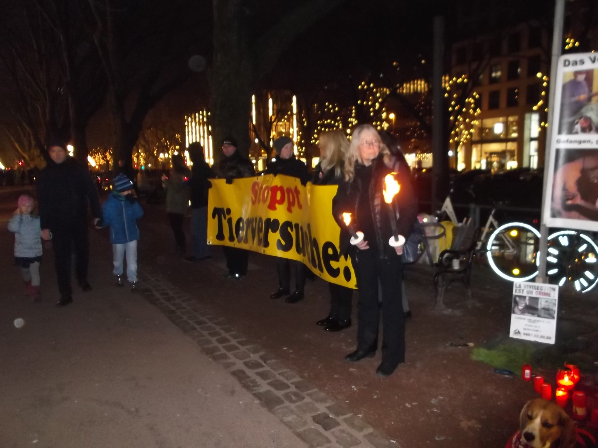 Une marche aux flambeaux et aux bougies en hommage aux millions d’animaux sacrifiés chaque année dans l’UE a ensuite parcouru les rues de Düsseldorf. Des calicots et pancartes étaient portés par les amis des animaux venus de toute l’Europe pour dire non à la vivisection.