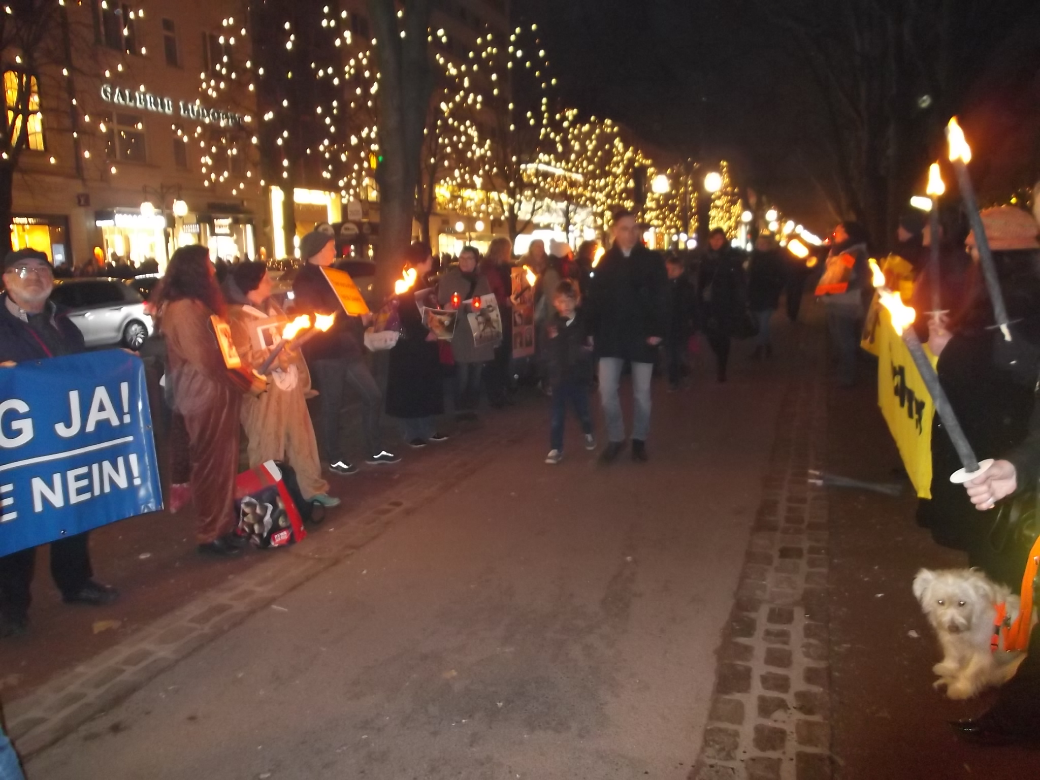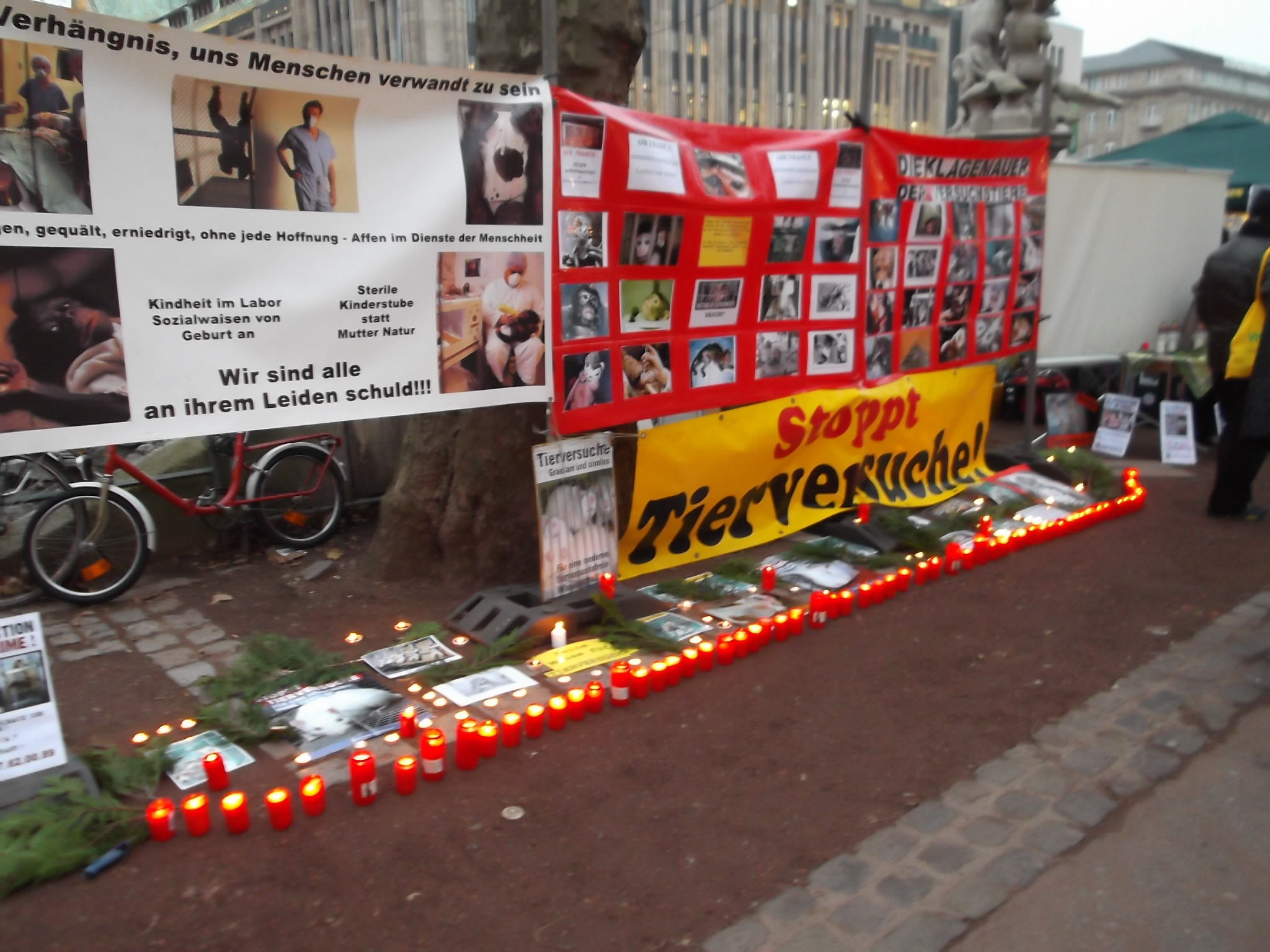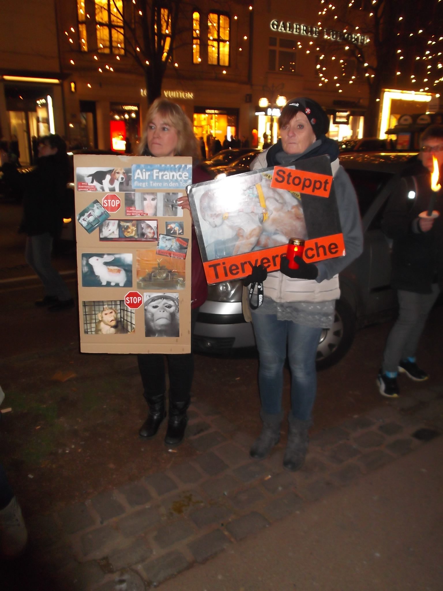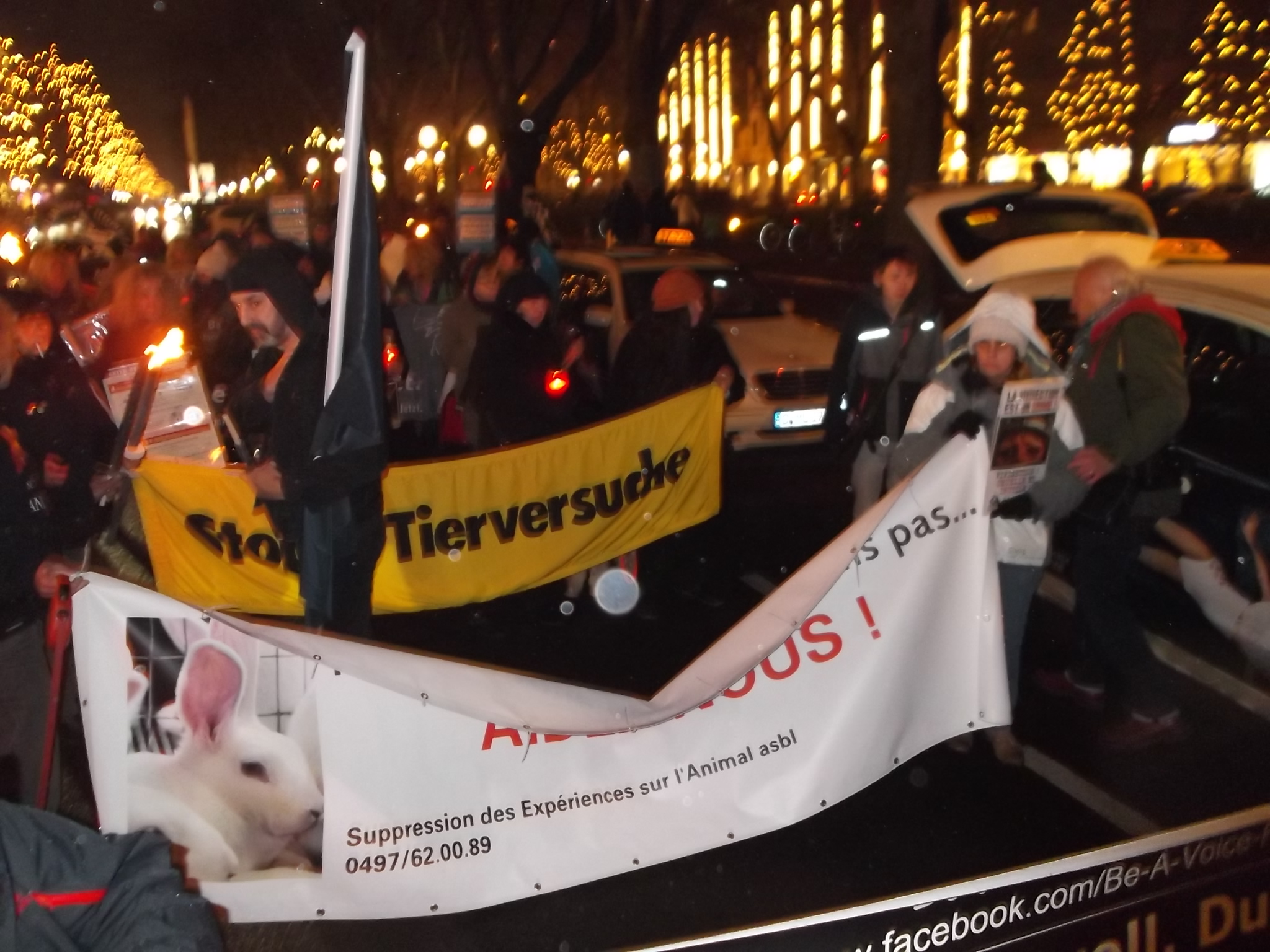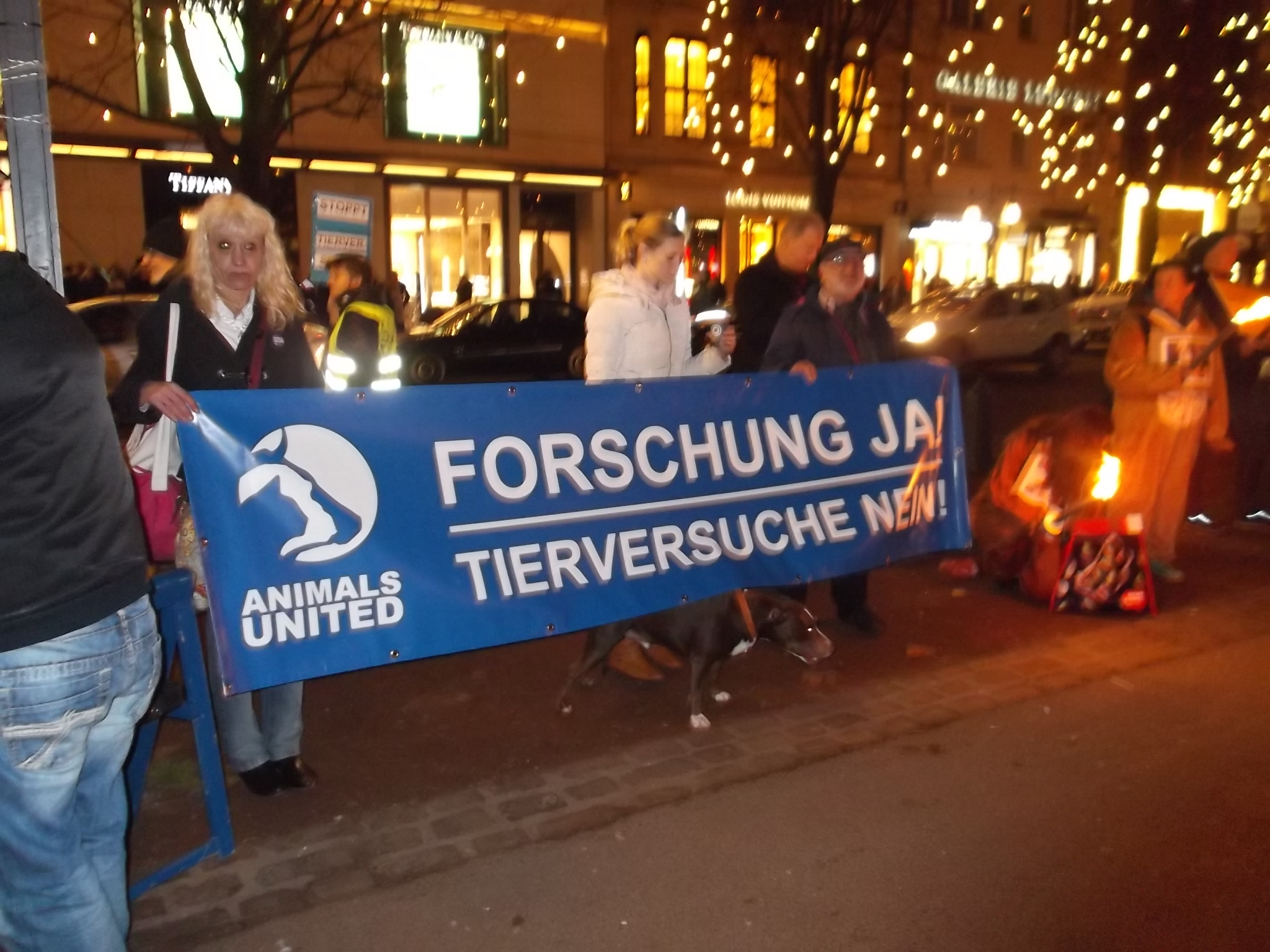 Une marche aux flambeaux et aux bougies en hommage aux millions d’animaux sacrifiés chaque année dans l’UE a ensuite parcouru les rues de Düsseldorf. Des calicots et pancartes étaient portés par les amis des animaux venus de toute l’Europe pour dire non à la vivisection.