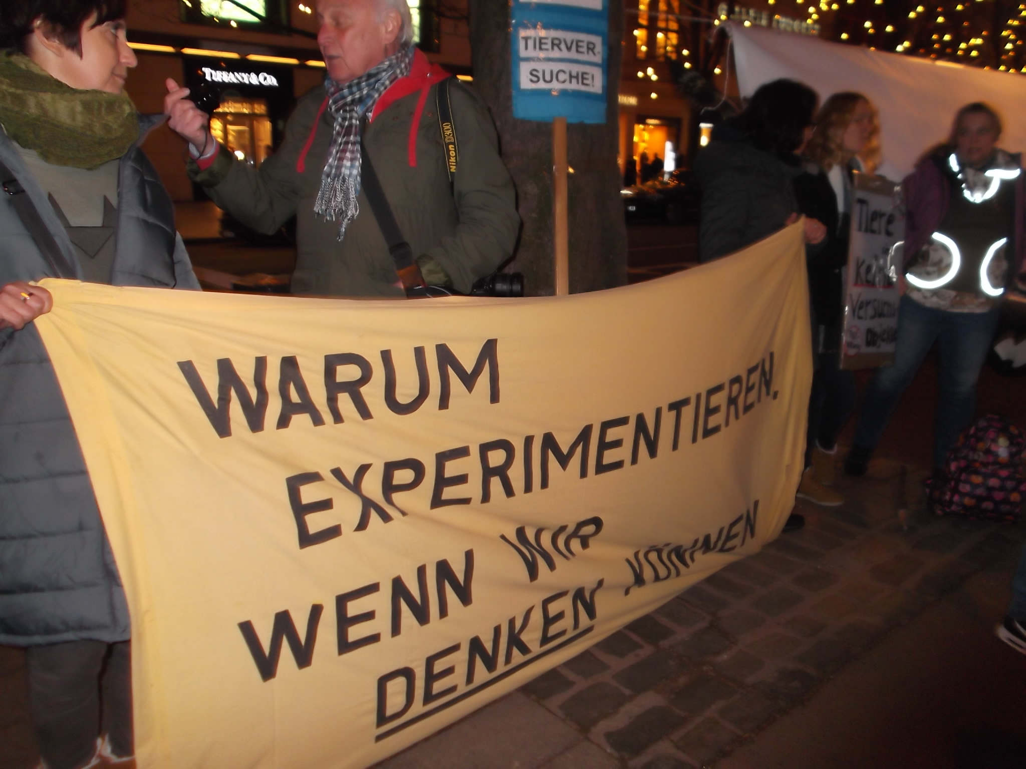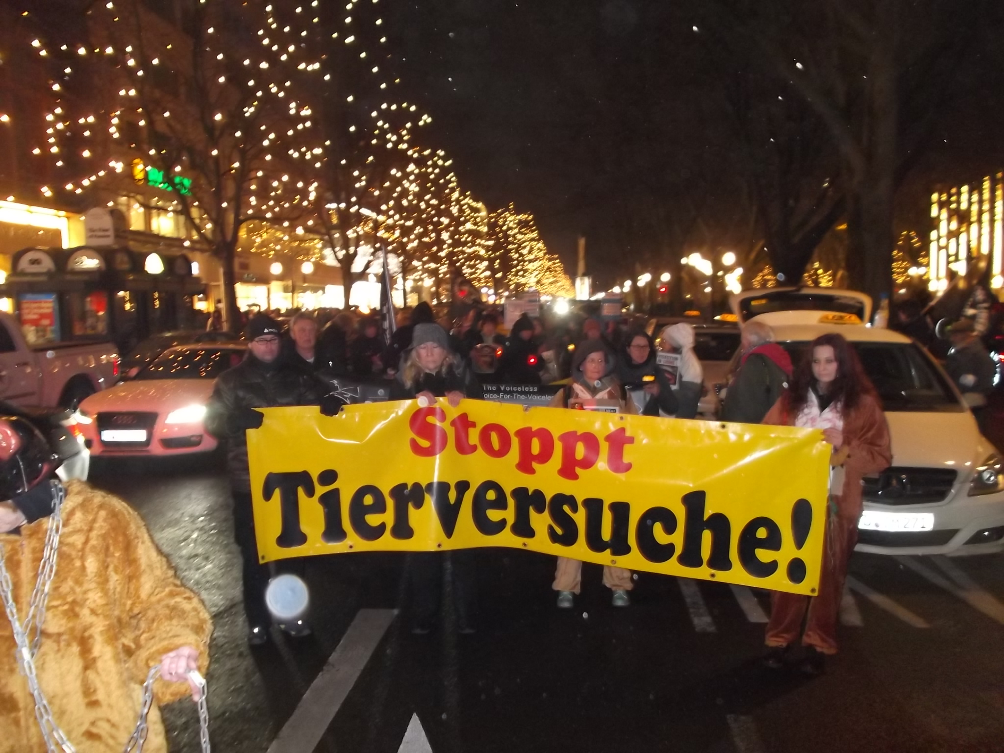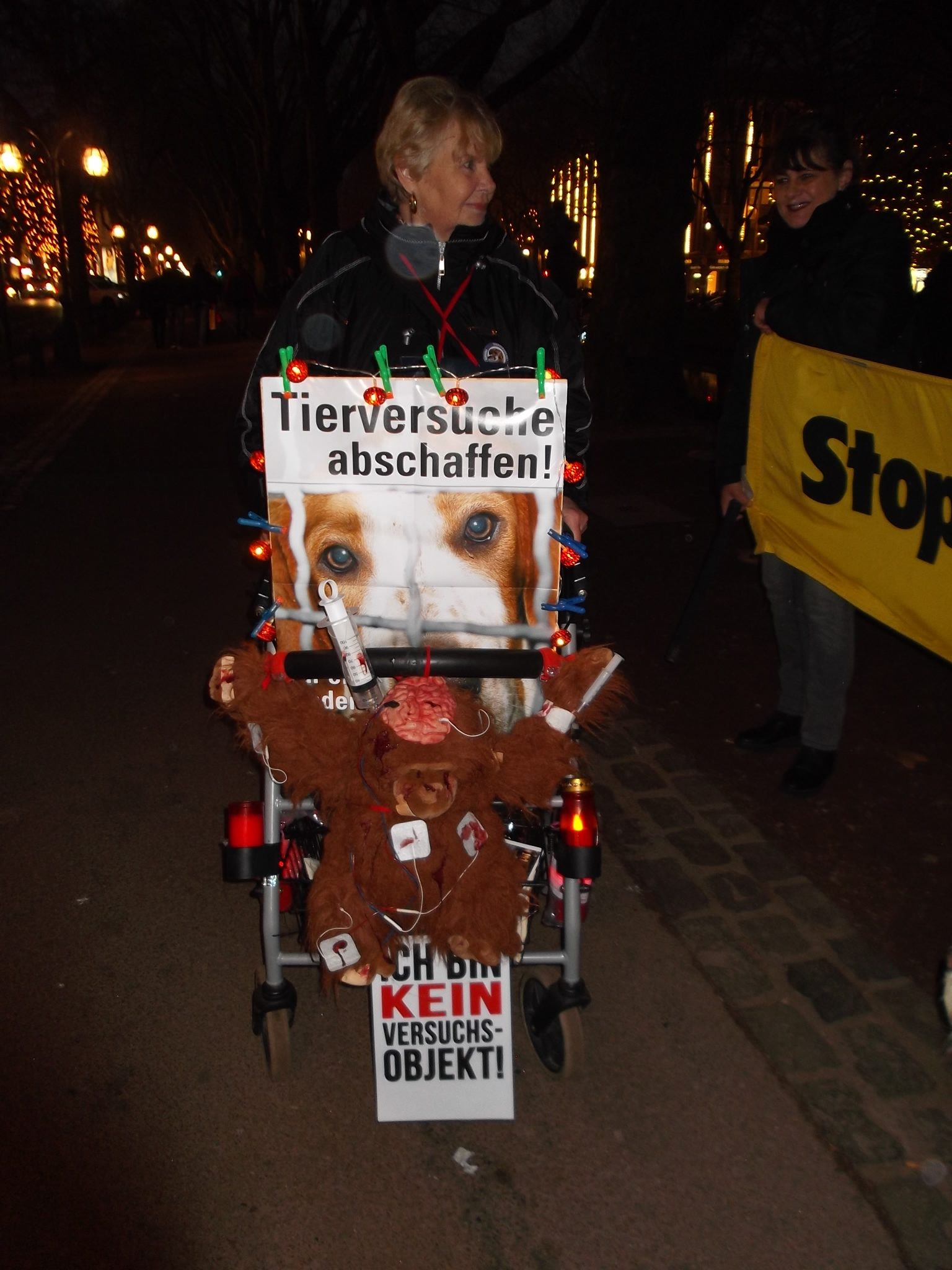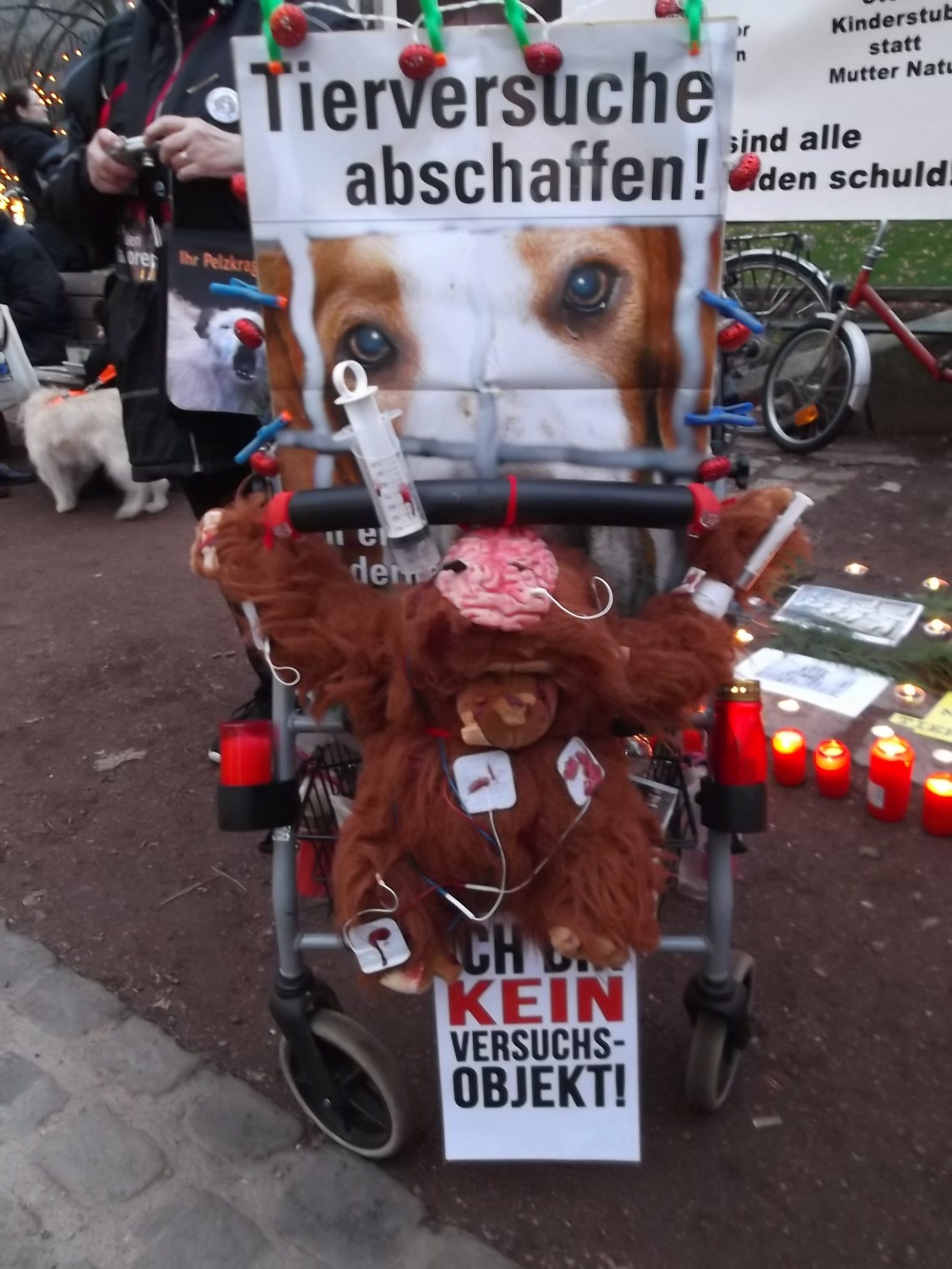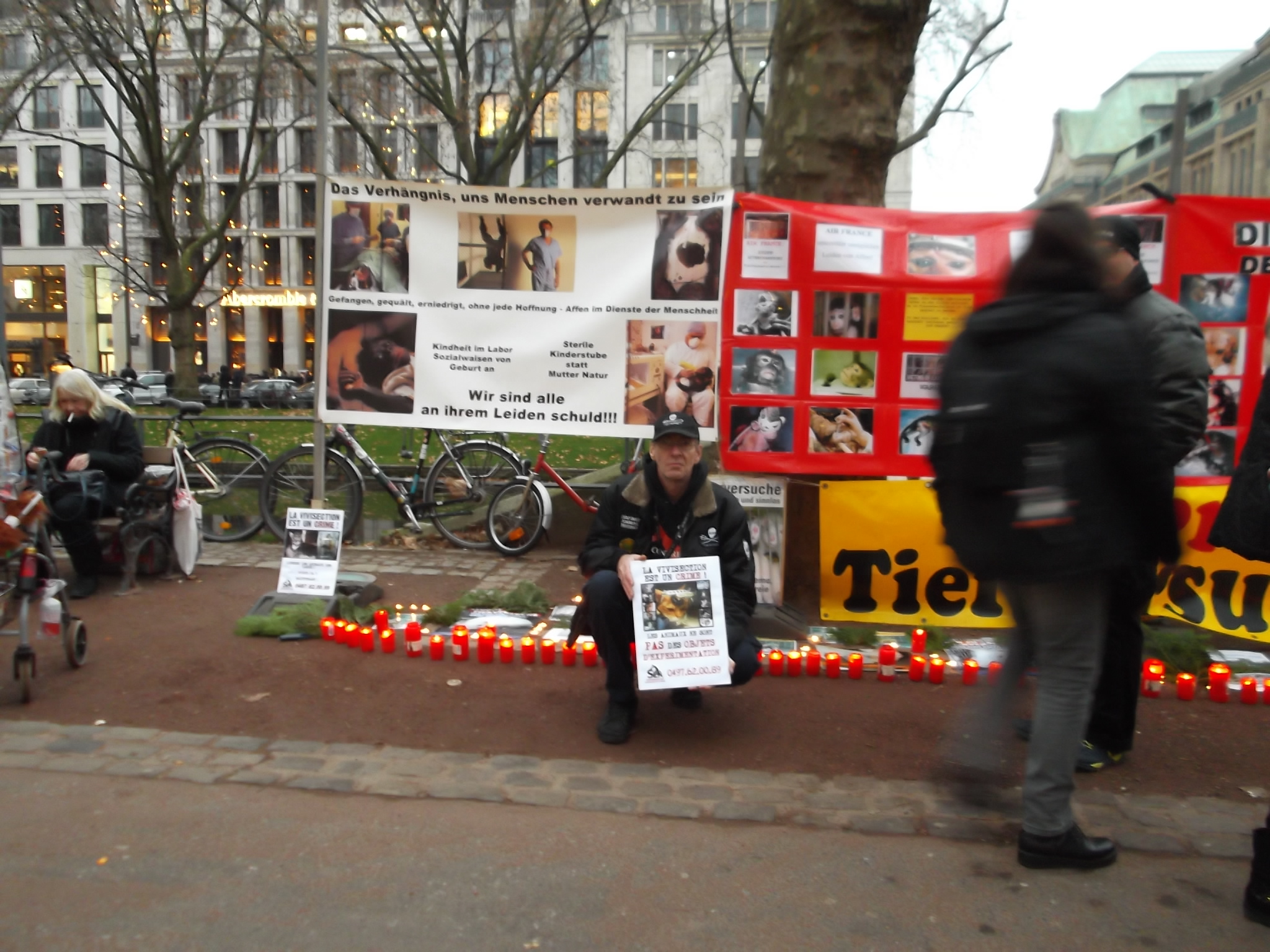 Une marche aux flambeaux et aux bougies en hommage aux millions d’animaux sacrifiés chaque année dans l’UE a ensuite parcouru les rues de Düsseldorf. Des calicots et pancartes étaient portés par les amis des animaux venus de toute l’Europe pour dire non à la vivisection.