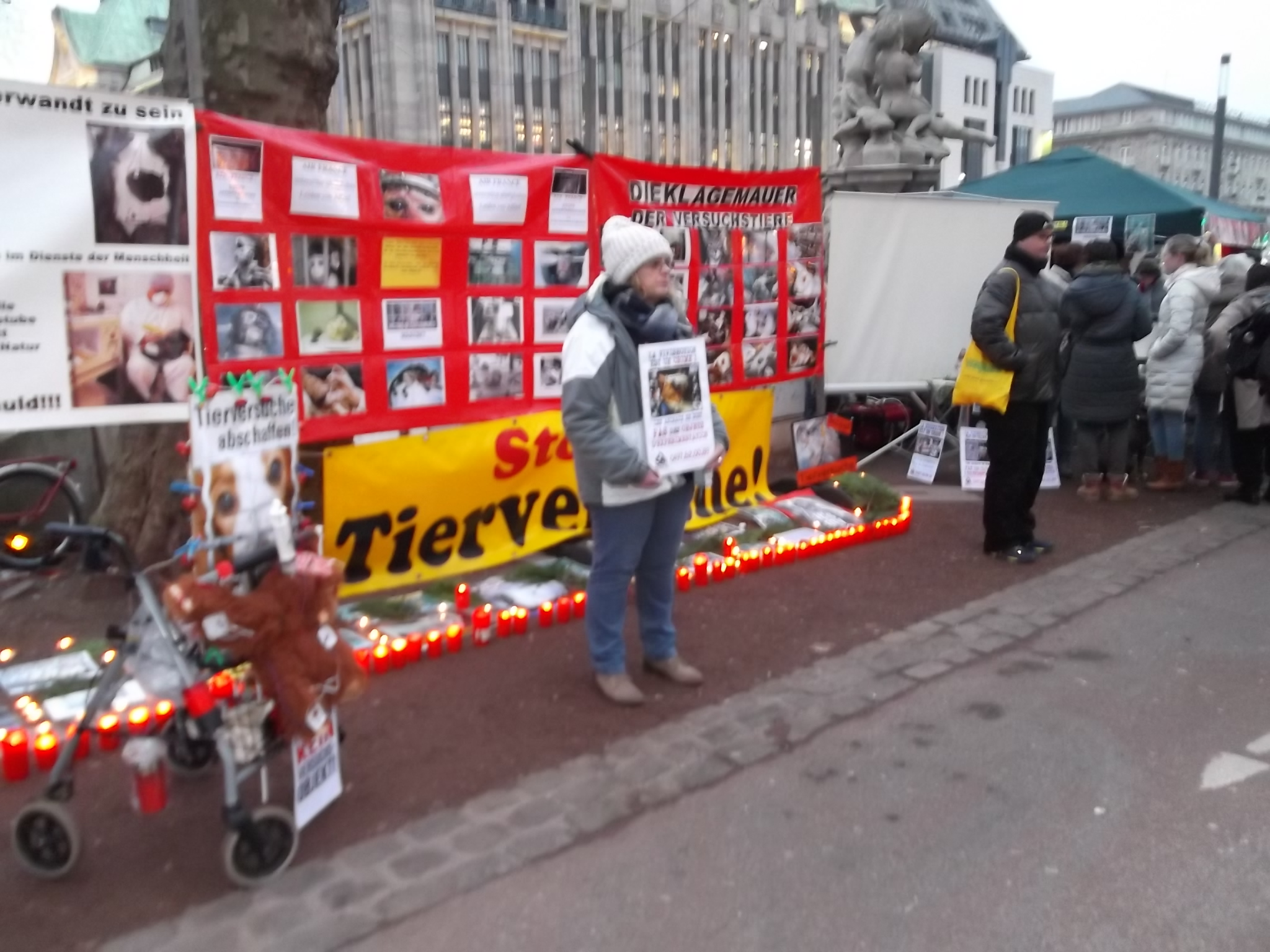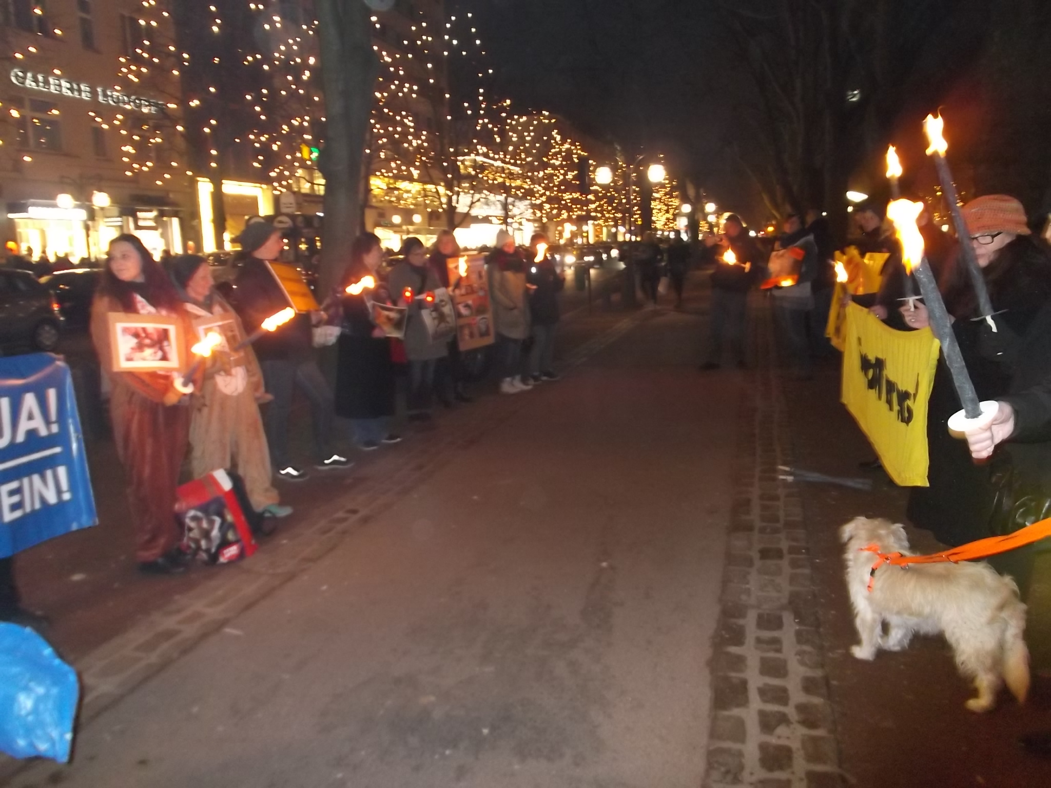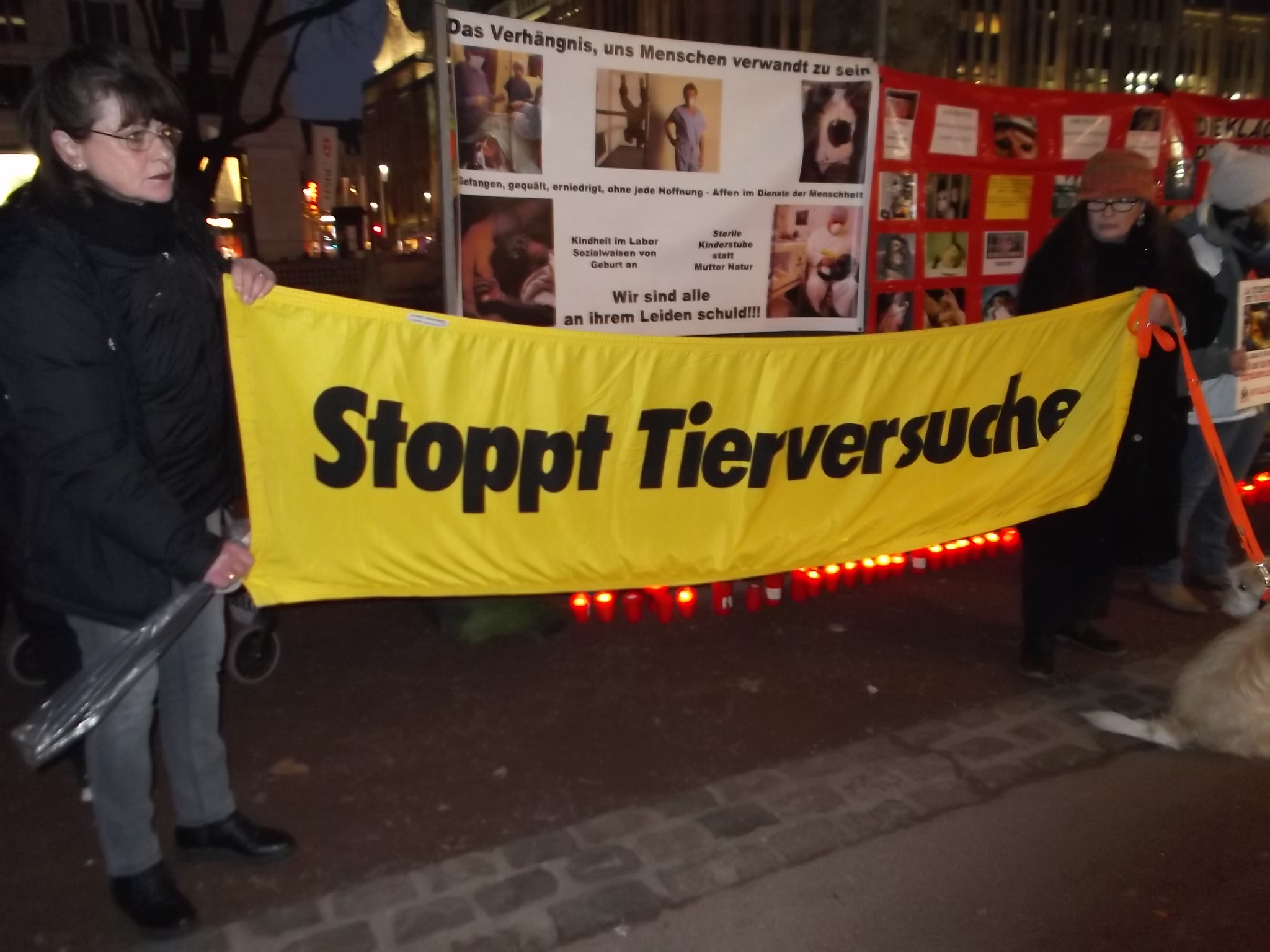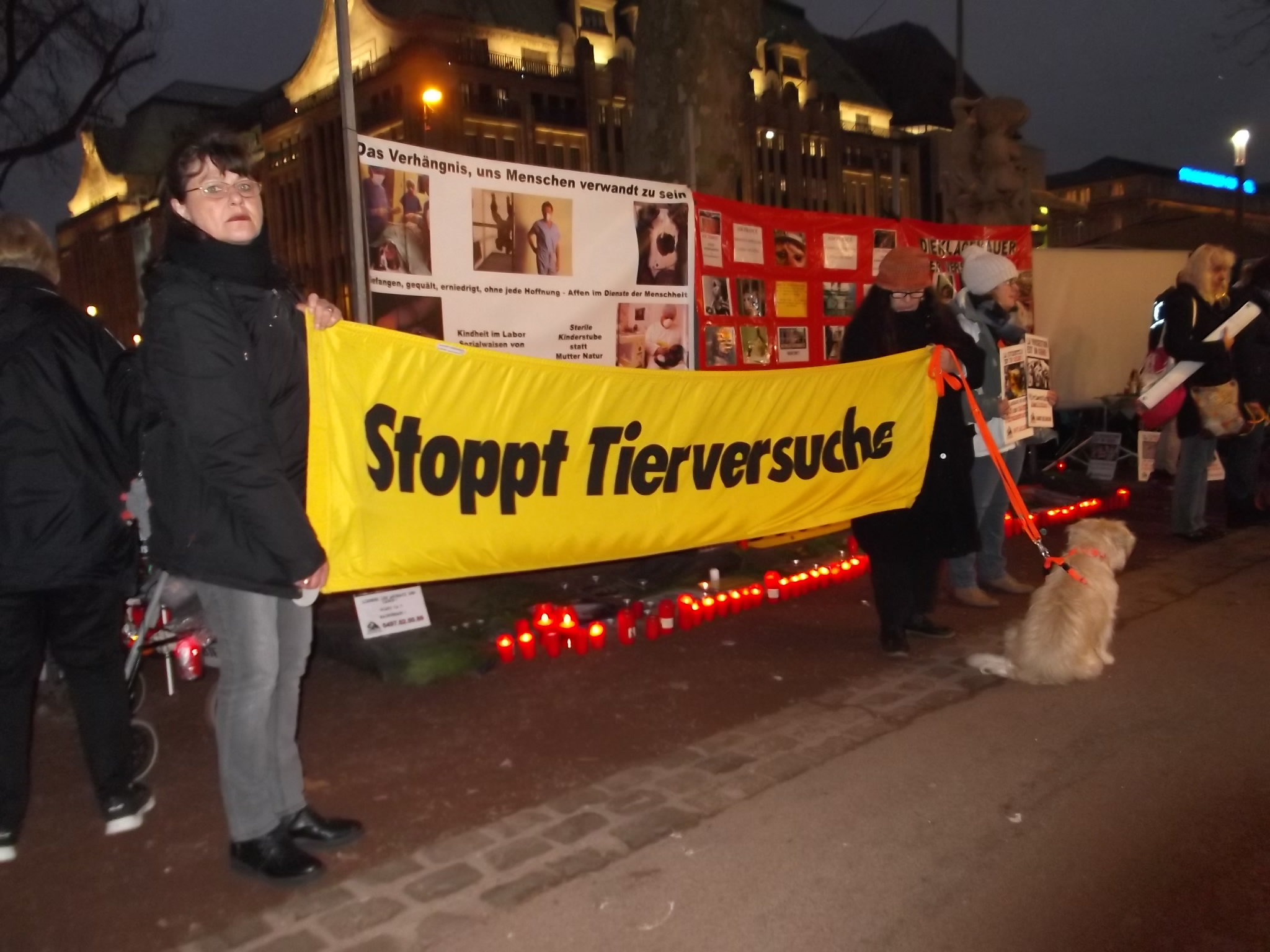 Liebe Freunde, sorry, bitten dass ich erst heute mich hier bei euch allen für die Teilnahme an unsere Fackelmahnwach am Samstag in Düsseldorf bedanke, aber mir ging es gestern gar nicht gut; Rheuma-und Kopfschmerzen und dazu noch Schmerzen in der Hüfte, weil ich hingefallen bin unter dem Pavillon. Alles nicht so schlimm wie alle diese schreckliche Schmerzen und Qualen, die so viele Tiere erleiden müssen! Das war am Samstag wieder super, toll mit euch zusammen! Ich danke jedem, der gekommen ist! Ihr seit wirklich klasse und ich bin euch für euren Einsatz sehr, sehr dankbar! Besonders danke ich Dany Dumbruch, der schon ganz früh zusammen mit seinem Hund Lucky aus Belgien gekommen ist, fleisig bei Aufbau geholfen hat und zusammen mit seinen 4 Freunden, die aus Belgien und Frankreich angereist sind demonstriert hat. Ihr seit große Klasse, Freunde! Unseren Fotografen: Walter E. Hermanns, Artiste Bruno, Thorsten Baumgärtner, Bodo Schmitz, Yves Dalcq (S.E.A. Suppression des Expériences sur l’Animal asbl Belgium), Brei Di, Heiko Schellenberger, Andreas Ferechi und Gassireport, danke ich von ganzen Herzen für die eindrucksvollen Fotos! Unseren Freunden Be A Voice for the Voiceless: Tanja Schwichtenberg, Andy Weimann und Martin Lück danke ich für die grandiose – wie immer – Zusammenarbeit! Tanja und Andy haben wieder tollen Chilli gekocht, Tanja ging als Affe im Marsch mit Andy zusammen und Martin Lück, der leider aus beruflichen Gründen nicht dabei sein könnte, hat die ganze « Technik » vorbereitet.Hier noch Mal herzlichen Dank für alles. Ich danke euch, liebe Freunde für die tollen Plakate, Schilder und Banner,die ihr mitgebracht habt, für Kostüme, für Fackeln und Kerzen: IHR und ich wiederhole IHR habt die Fackelmanhwache zum etwas besonderen gemacht und dafür gesorgt, dass wir so viel Aufmerksamkeit von den Passanten bekommen haben und vielleicht manche Menschen zum Nachdenken gebracht haben. Allen, die trotz der späten Stunde nach dem Marsch noch zu Tierversuchslabor gefahren sind, danke ich ganz besonders. Wir sind dort 19 Leute gewesen! Und ich bin mir sicher, dass die arme Tiere das gespührt haben, dass wir da waren. Das war für sie vielleicht das erstes und einziges Mal, dass sie Liebe gespührt haben. Ich danke euch, ihr Lieben dafür von ganzem Herzen! Auch allen Hunden, die so zahlreich in unsere Fackelmahnwache teil genommen haben: VIELEN, VIELEN DANK! Ihr lässt immer mein Herz schneller schlagen, ich freue mich immer wenn ihr kommt und freue mich über jedem von euch! Die tollen Fotos und Videos habe ich schon mehrmals gesehen und werde mir noch warscheinlich paar Mal anschauen und an jedem von euch mit viel Dankbarkeit und Liebe denken. Eure Danuta.