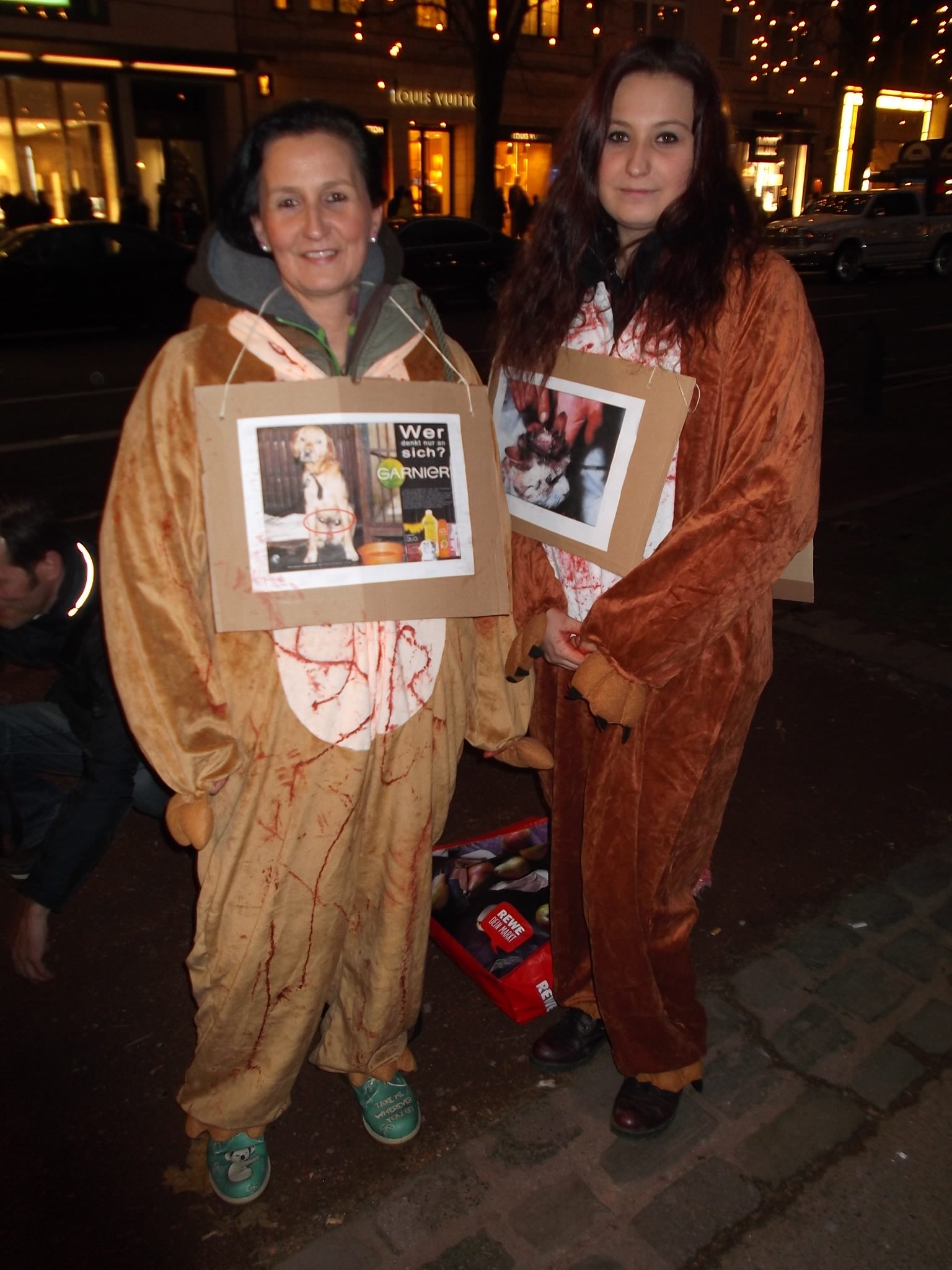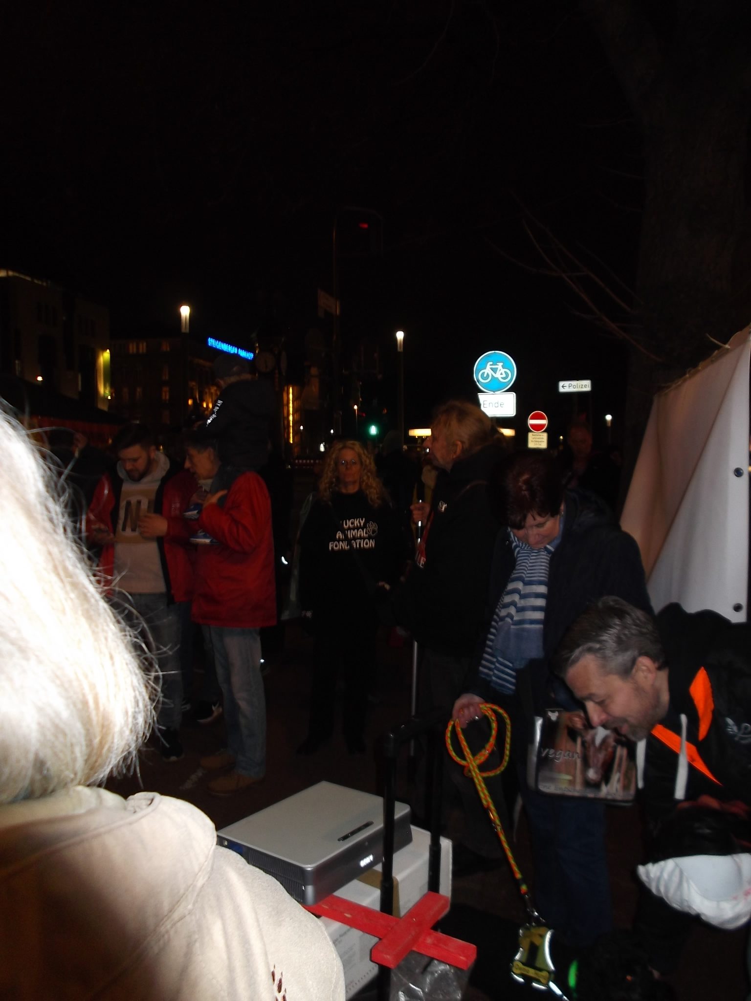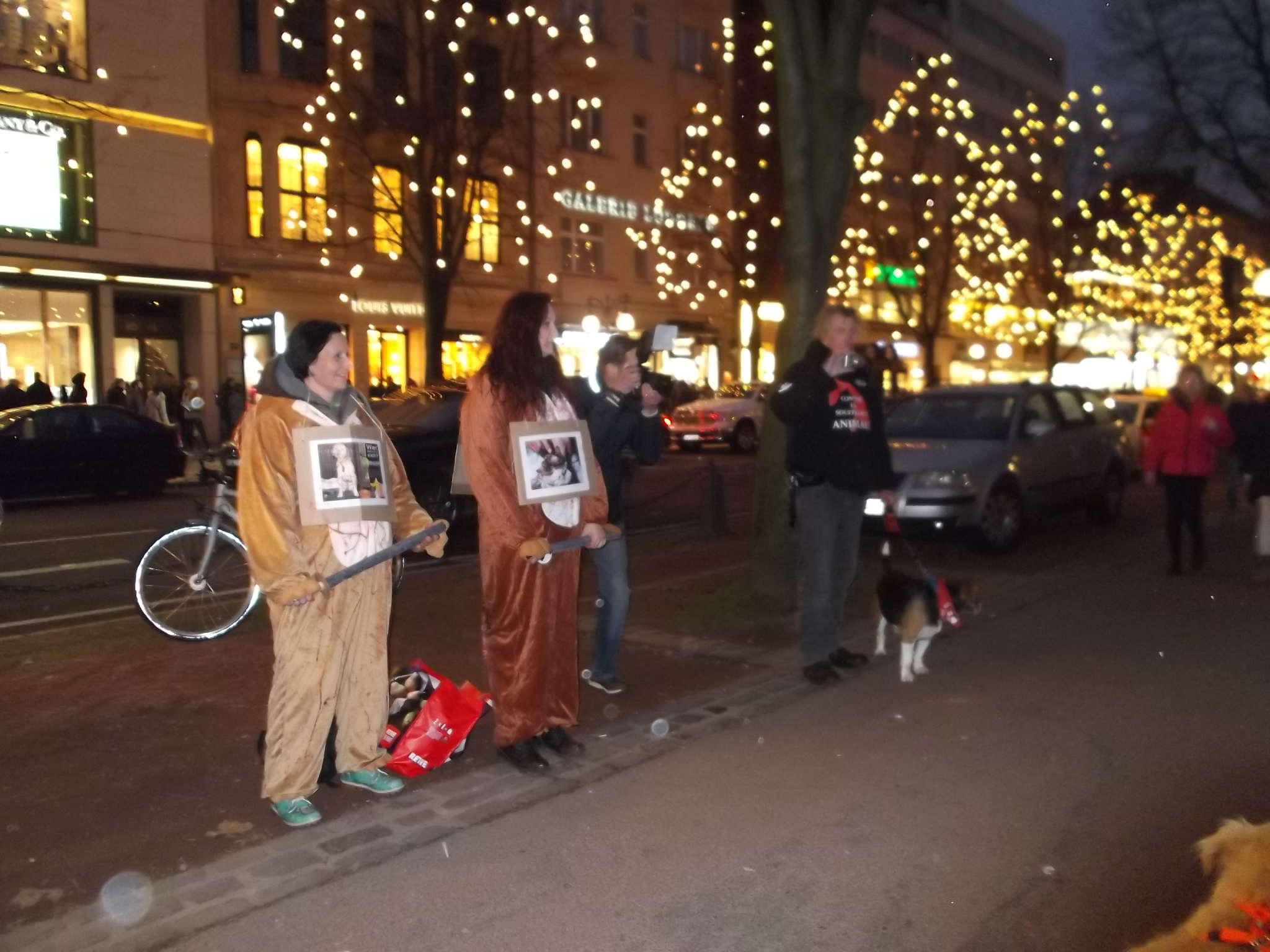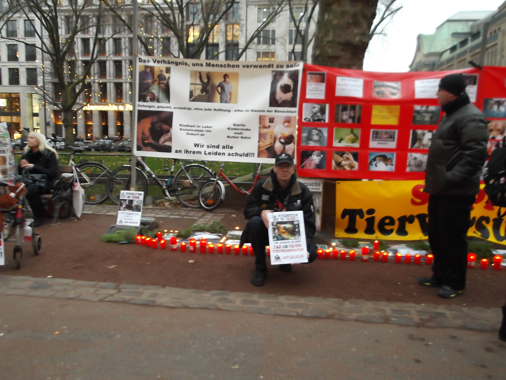 Liebe Freunde, sorry, bitten dass ich erst heute mich hier bei euch allen für die Teilnahme an unsere Fackelmahnwach am Samstag in Düsseldorf bedanke, aber mir ging es gestern gar nicht gut; Rheuma-und Kopfschmerzen und dazu noch Schmerzen in der Hüfte, weil ich hingefallen bin unter dem Pavillon. Alles nicht so schlimm wie alle diese schreckliche Schmerzen und Qualen, die so viele Tiere erleiden müssen! Das war am Samstag wieder super, toll mit euch zusammen! Ich danke jedem, der gekommen ist! Ihr seit wirklich klasse und ich bin euch für euren Einsatz sehr, sehr dankbar! Besonders danke ich Dany Dumbruch, der schon ganz früh zusammen mit seinem Hund Lucky aus Belgien gekommen ist, fleisig bei Aufbau geholfen hat und zusammen mit seinen 4 Freunden, die aus Belgien und Frankreich angereist sind demonstriert hat. Ihr seit große Klasse, Freunde! Unseren Fotografen: Walter E. Hermanns, Artiste Bruno, Thorsten Baumgärtner, Bodo Schmitz, Yves Dalcq (S.E.A. Suppression des Expériences sur l’Animal asbl Belgium), Brei Di, Heiko Schellenberger, Andreas Ferechi und Gassireport, danke ich von ganzen Herzen für die eindrucksvollen Fotos! Unseren Freunden Be A Voice for the Voiceless: Tanja Schwichtenberg, Andy Weimann und Martin Lück danke ich für die grandiose – wie immer – Zusammenarbeit! Tanja und Andy haben wieder tollen Chilli gekocht, Tanja ging als Affe im Marsch mit Andy zusammen und Martin Lück, der leider aus beruflichen Gründen nicht dabei sein könnte, hat die ganze « Technik » vorbereitet.Hier noch Mal herzlichen Dank für alles. Ich danke euch, liebe Freunde für die tollen Plakate, Schilder und Banner,die ihr mitgebracht habt, für Kostüme, für Fackeln und Kerzen: IHR und ich wiederhole IHR habt die Fackelmanhwache zum etwas besonderen gemacht und dafür gesorgt, dass wir so viel Aufmerksamkeit von den Passanten bekommen haben und vielleicht manche Menschen zum Nachdenken gebracht haben. Allen, die trotz der späten Stunde nach dem Marsch noch zu Tierversuchslabor gefahren sind, danke ich ganz besonders. Wir sind dort 19 Leute gewesen! Und ich bin mir sicher, dass die arme Tiere das gespührt haben, dass wir da waren. Das war für sie vielleicht das erstes und einziges Mal, dass sie Liebe gespührt haben. Ich danke euch, ihr Lieben dafür von ganzem Herzen! Auch allen Hunden, die so zahlreich in unsere Fackelmahnwache teil genommen haben: VIELEN, VIELEN DANK! Ihr lässt immer mein Herz schneller schlagen, ich freue mich immer wenn ihr kommt und freue mich über jedem von euch! Die tollen Fotos und Videos habe ich schon mehrmals gesehen und werde mir noch warscheinlich paar Mal anschauen und an jedem von euch mit viel Dankbarkeit und Liebe denken. Eure Danuta.