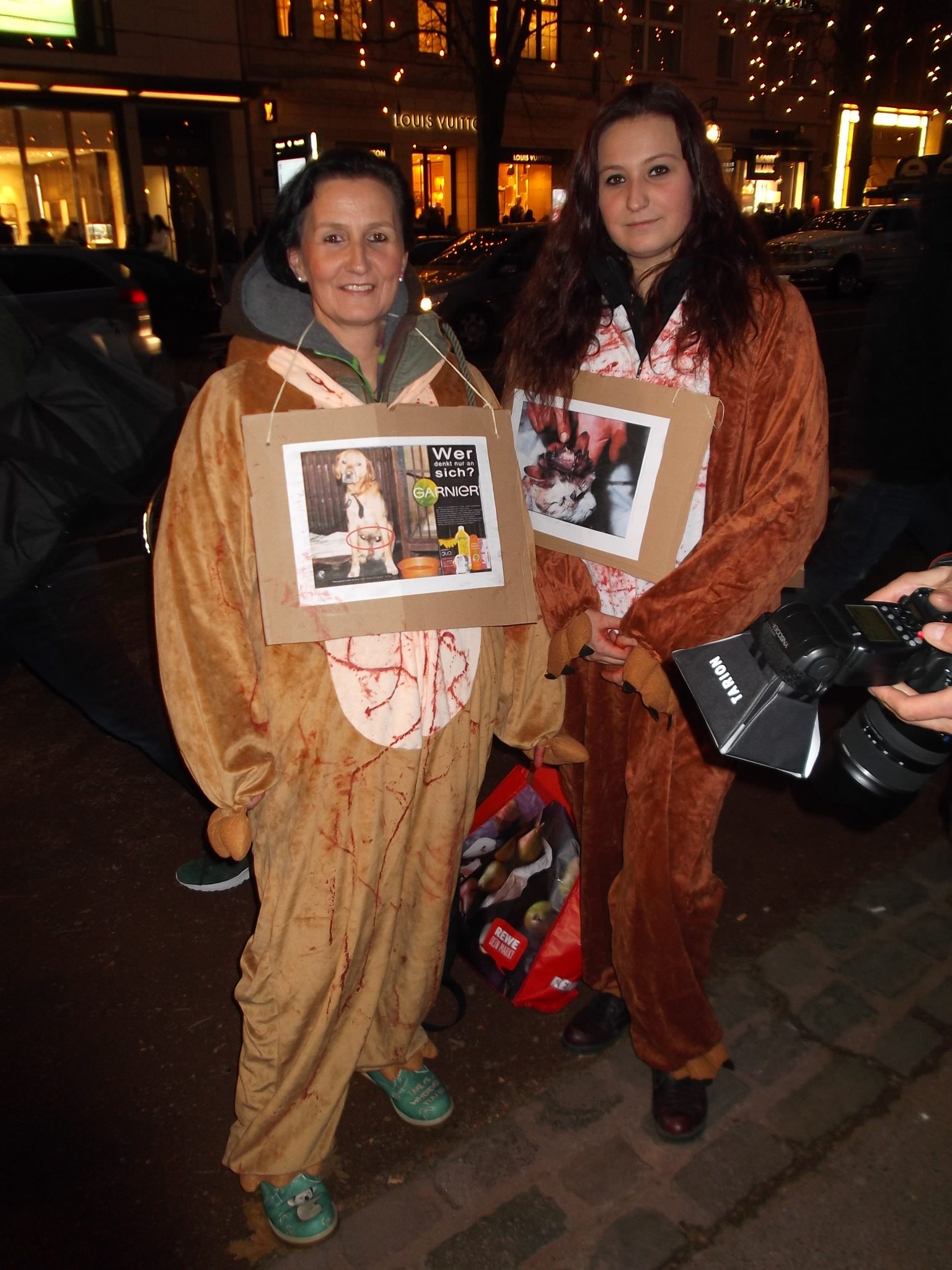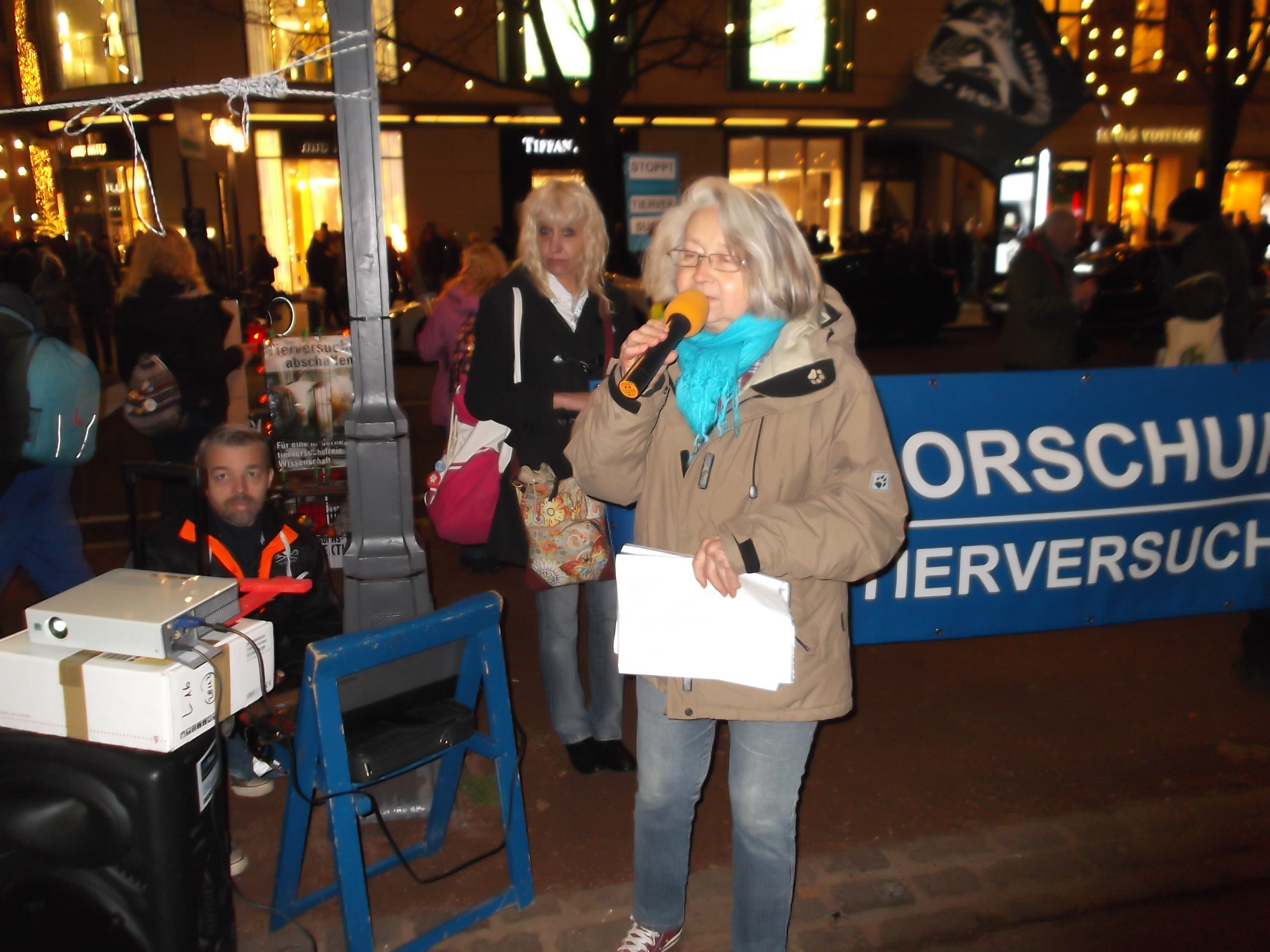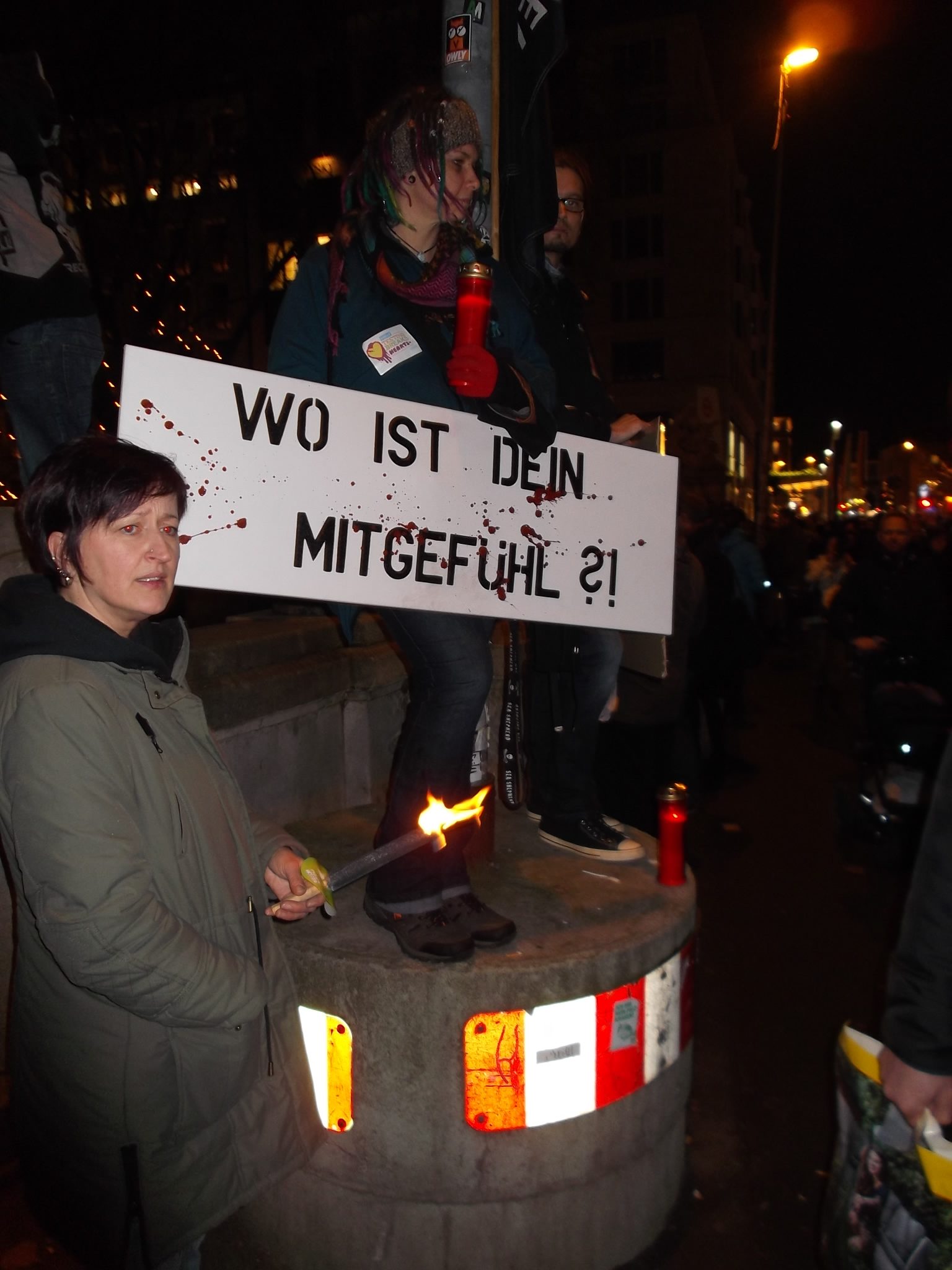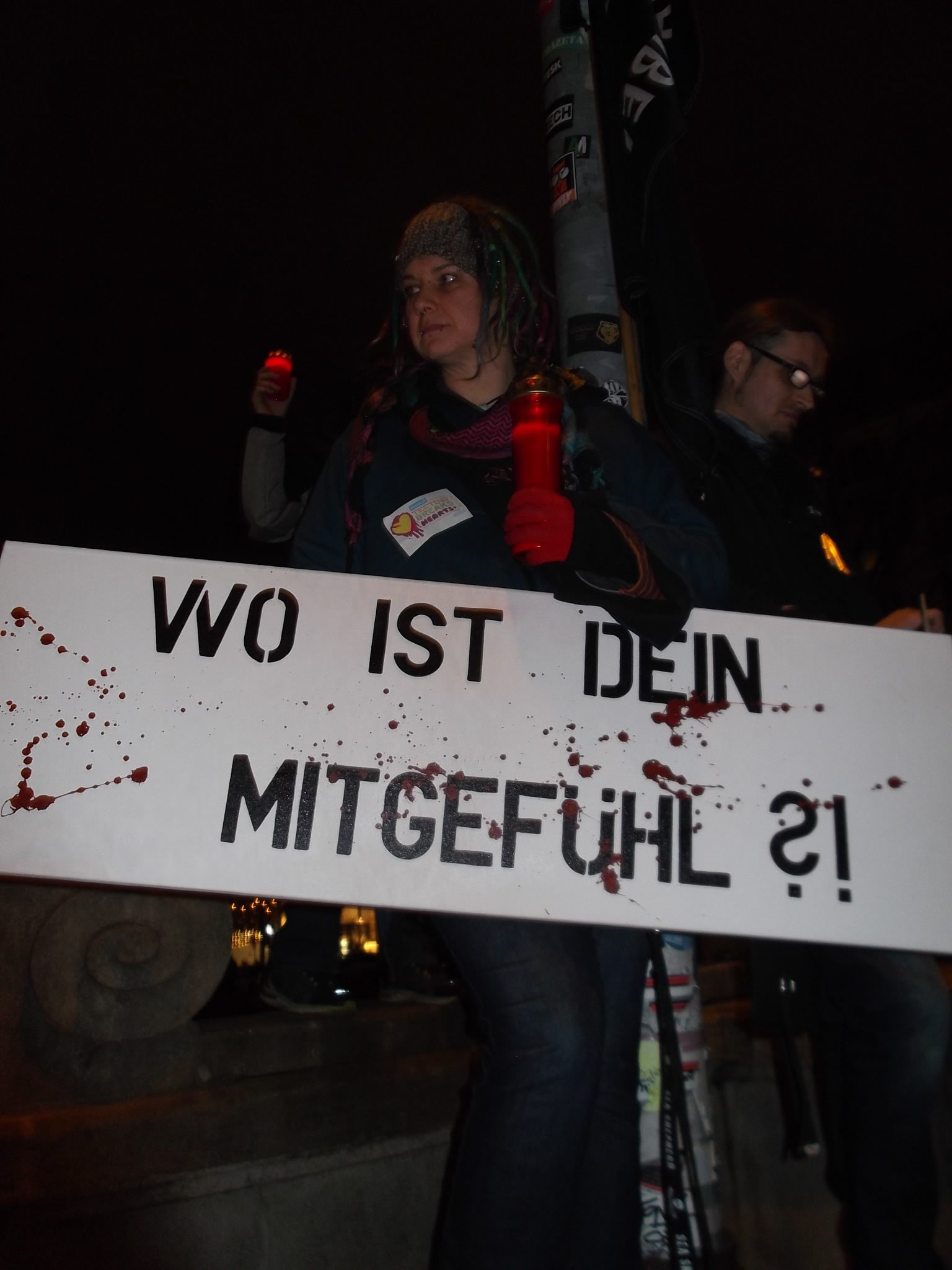 Liebe Freunde, sorry, bitten dass ich erst heute mich hier bei euch allen für die Teilnahme an unsere Fackelmahnwach am Samstag in Düsseldorf bedanke, aber mir ging es gestern gar nicht gut; Rheuma-und Kopfschmerzen und dazu noch Schmerzen in der Hüfte, weil ich hingefallen bin unter dem Pavillon. Alles nicht so schlimm wie alle diese schreckliche Schmerzen und Qualen, die so viele Tiere erleiden müssen! Das war am Samstag wieder super, toll mit euch zusammen! Ich danke jedem, der gekommen ist! Ihr seit wirklich klasse und ich bin euch für euren Einsatz sehr, sehr dankbar! Besonders danke ich Dany Dumbruch, der schon ganz früh zusammen mit seinem Hund Lucky aus Belgien gekommen ist, fleisig bei Aufbau geholfen hat und zusammen mit seinen 4 Freunden, die aus Belgien und Frankreich angereist sind demonstriert hat. Ihr seit große Klasse, Freunde! Unseren Fotografen: Walter E. Hermanns, Artiste Bruno, Thorsten Baumgärtner, Bodo Schmitz, Yves Dalcq (S.E.A. Suppression des Expériences sur l’Animal asbl Belgium), Brei Di, Heiko Schellenberger, Andreas Ferechi und Gassireport, danke ich von ganzen Herzen für die eindrucksvollen Fotos! Unseren Freunden Be A Voice for the Voiceless: Tanja Schwichtenberg, Andy Weimann und Martin Lück danke ich für die grandiose – wie immer – Zusammenarbeit! Tanja und Andy haben wieder tollen Chilli gekocht, Tanja ging als Affe im Marsch mit Andy zusammen und Martin Lück, der leider aus beruflichen Gründen nicht dabei sein könnte, hat die ganze « Technik » vorbereitet.Hier noch Mal herzlichen Dank für alles. Ich danke euch, liebe Freunde für die tollen Plakate, Schilder und Banner,die ihr mitgebracht habt, für Kostüme, für Fackeln und Kerzen: IHR und ich wiederhole IHR habt die Fackelmanhwache zum etwas besonderen gemacht und dafür gesorgt, dass wir so viel Aufmerksamkeit von den Passanten bekommen haben und vielleicht manche Menschen zum Nachdenken gebracht haben. Allen, die trotz der späten Stunde nach dem Marsch noch zu Tierversuchslabor gefahren sind, danke ich ganz besonders. Wir sind dort 19 Leute gewesen! Und ich bin mir sicher, dass die arme Tiere das gespührt haben, dass wir da waren. Das war für sie vielleicht das erstes und einziges Mal, dass sie Liebe gespührt haben. Ich danke euch, ihr Lieben dafür von ganzem Herzen! Auch allen Hunden, die so zahlreich in unsere Fackelmahnwache teil genommen haben: VIELEN, VIELEN DANK! Ihr lässt immer mein Herz schneller schlagen, ich freue mich immer wenn ihr kommt und freue mich über jedem von euch! Die tollen Fotos und Videos habe ich schon mehrmals gesehen und werde mir noch warscheinlich paar Mal anschauen und an jedem von euch mit viel Dankbarkeit und Liebe denken. Eure Danuta.