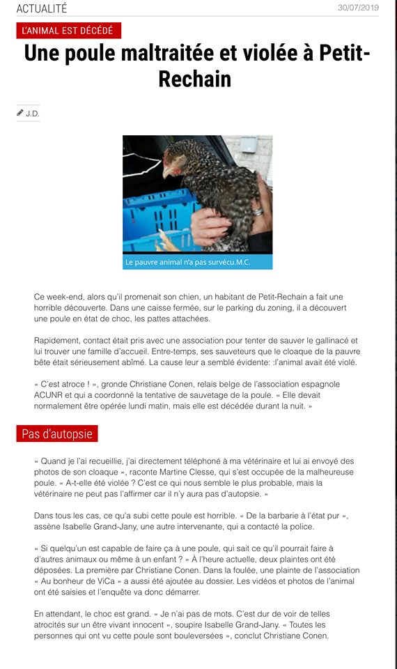La poule retrouvée à Verviers a bien été violée, une pétition lancée suite à cet acte odieux: «Il y a peut-être un détraqué sexuel dans le village»