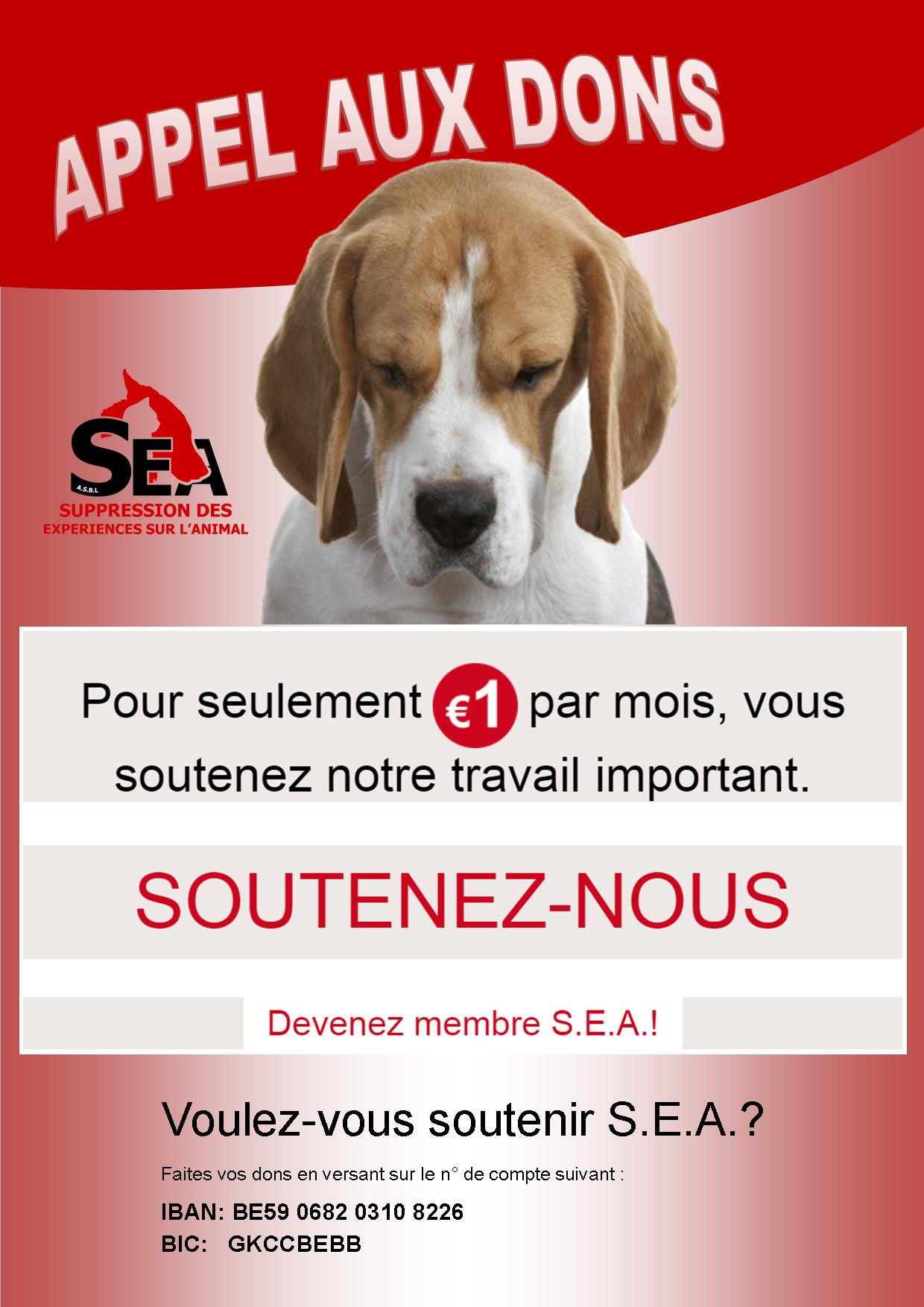 Vous pouvez faire un don de 5 €, 10 €, 15 € sur le compte S.E.A. BE59 0682 0310 8226, rue des Cotillages 90, 4000 LIEGE