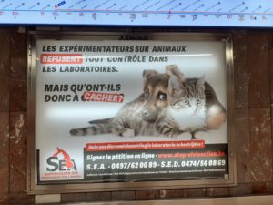 Comme vous le savez, les tortures infligées aux animaux destinés à l’expérimentation se déroulent à l’abri des regards, derrière les murs des laboratoires. Actuellement, il existe un véritable huis-clos en ce domaine. Du 5 octobre 2021 et durant quatre semaines, une campagne destinée à dénoncer l’absence de contrôles réels dans les labos aura lieu dans 15 stations du métro bruxellois.