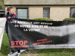 S.E.A. était présente devant l’animalerie de l’ULB pour dénoncer les grandes souffrances infligées aux animaux dans les laboratoires de cette université.
