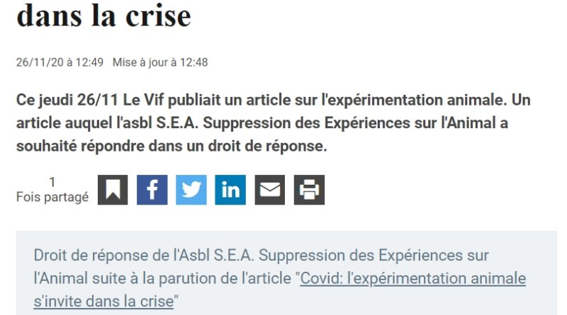 Ce jeudi 26/11 Le Vif publiait un article sur l’expérimentation animale. Un article auquel l’asbl S.E.A. Suppression des Expériences sur
